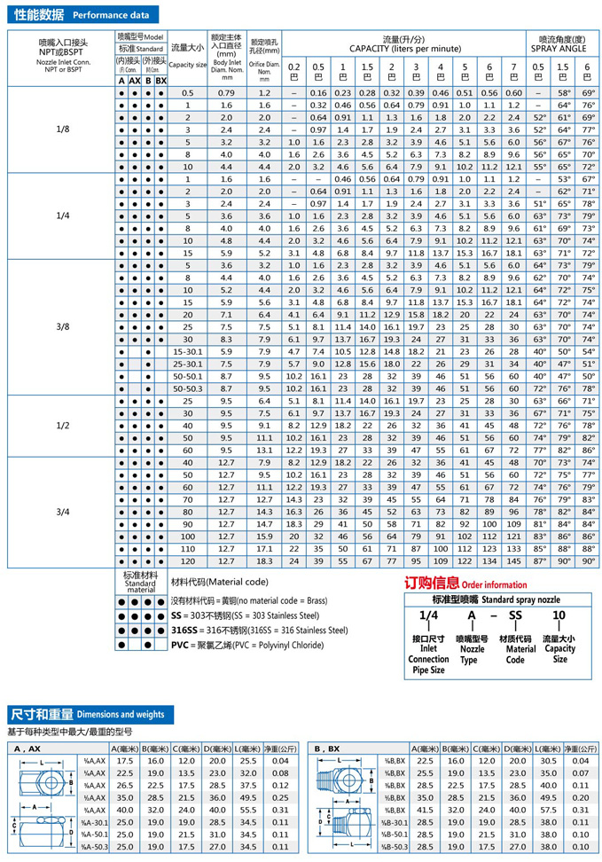 AX-W and BX-W series wide-angle hollow cone nozzles have the same performance as A-W and B-W series, plus the advantages of extended life slope bottom design to reduce the "drilling effect" of the liquid swirl in the swirl chamber.